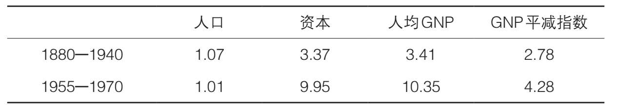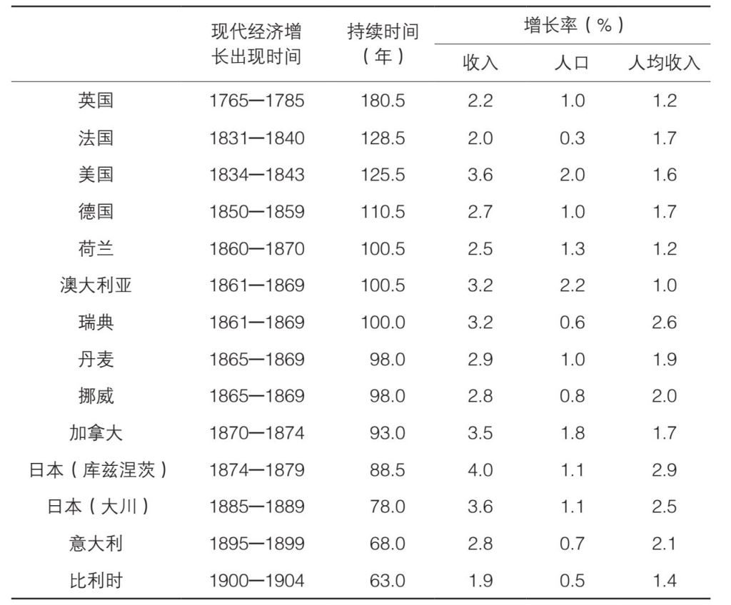 在许多时候,当一个经济体达到其发展的某个关键点时,都有一种增长加速和结构变化加快的趋势。这一关键点就是罗斯托(Rostow,1960)所谓的“起飞”,或者库兹涅茨(Kuznets,1959)所谓的“现代经济增长的开端”。库兹涅茨(1959,第一讲)罗列了现代经济增长的特征:(1)现代科学思想和技术在工业中的应用;(2)实际人均产出持续快速增长,通常伴随着人口的快速增长,虽然未必总是如此;(3)产业结构迅速转型,即各部门的产出、劳动力和资本存量的分配持续发生变化;(4)扩大国际交流。库兹涅茨将日本出现现代经济增长的时间确定为1874—1879年。