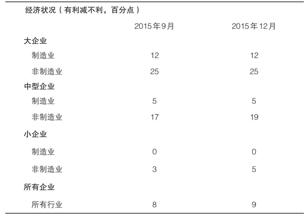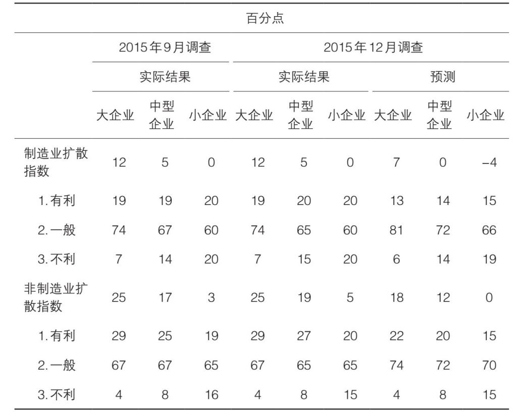 表4.3展示了2015年12月短观调查的部分结果,当时有1万多家企业接受了调查,其中98.5%的企业做出了答复。它显示了企业对经济状况的回答,即“有利”、“一般”或者“不利”。该表显示了扩散指数(“净百分点”)的计算方法,即对这一问题,回答“有利”的受访企业百分比减去回答“不利”的受访企业百分比。调查还按照制造业和非制造业以及受访企业规模(大、中、小)分别列示。
