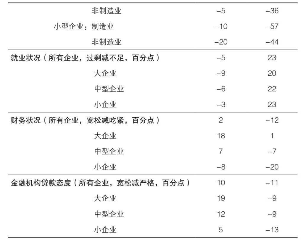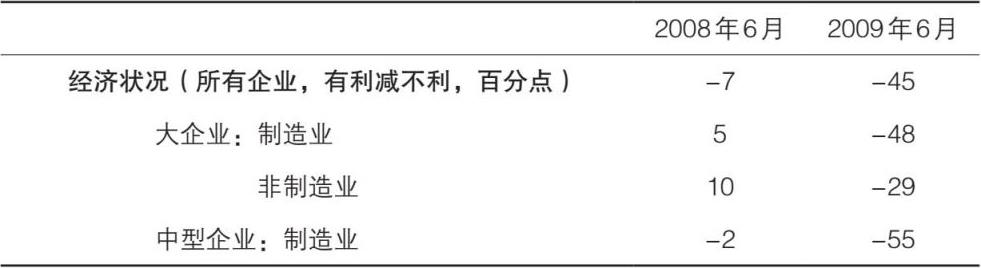 一个更引人注目的例子是,表4.5展示了2008年6月至2009年6月短观调查的观点发生的变化。表中数据清楚地表明,经济状况在一年内恶化了。更多的企业认为经济状况不利而非有利,就业过剩而非不足,财务状况吃紧而非宽松,银行贷款态度严格而非宽松。日本企业明显感受到了2008年金融危机之后出现的全球性经济衰退。