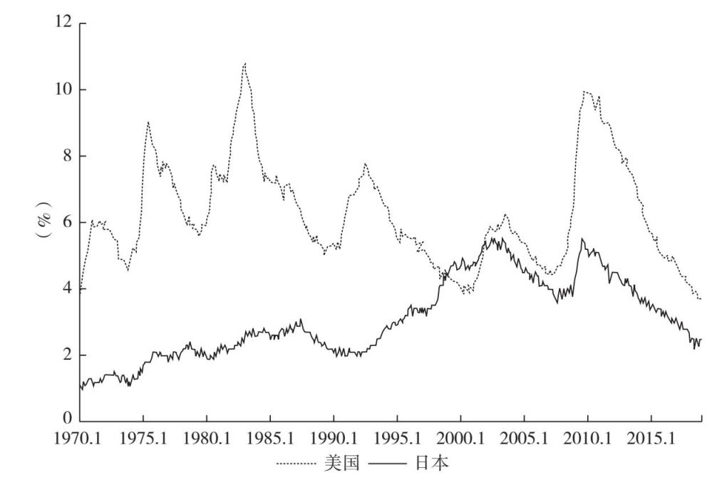 然而,在20世纪90年代初资产价格崩溃之后出现的停滞期,日本失业率迅速攀升,在1998年11月,也就是日本银行业危机爆发大约一年后,日本的失业率开始高于美国;而且这一逆转一直持续到2001年11月。从2003年到2014年,随着产出活动的扩大和收缩,日本失业率大幅波动,这表明日本的劳动力市场变得更有灵活性,与美国的劳动力市场也更相似了。