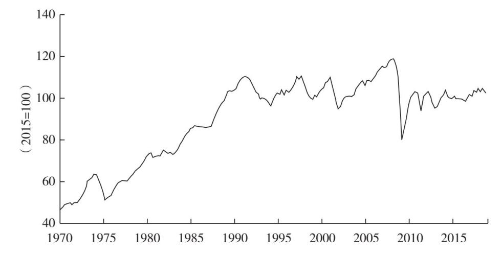 图4.6显示了工业生产指数,这是一个同步指数。20世纪七八十年代,日本工业生产稳步增长,除了第一次石油危机之后有短暂的下降。然而,从1990年到2014年,这一趋势停止了,指数一直在某一常数值附近波动。在雷曼兄弟破产后,该指数大幅跌至20世纪80年代中期的水平。虽然这一指数很快复苏,但是截至2018年第三季度,它还没有恢复到2008年初的峰值。