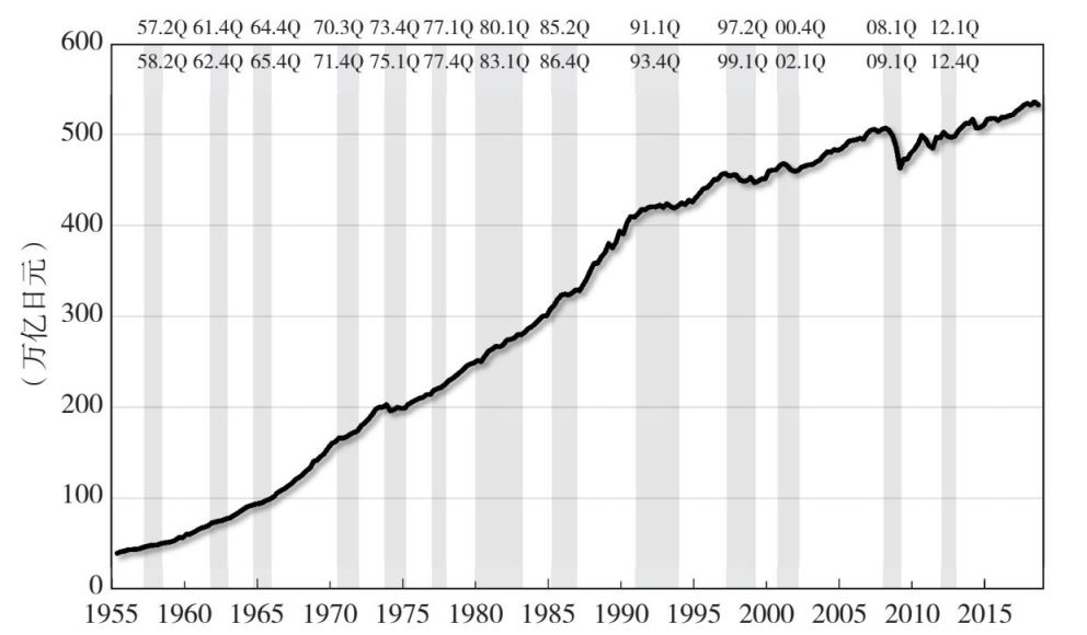 GDP增长是衡量经济扩张和收缩(或衰退)最常用的综合指标。因此,考察一下官方确定的经济周期与GDP波动有多密切,不乏趣味。图4.4显示了1955年至今日本实际GDP的季度数据。