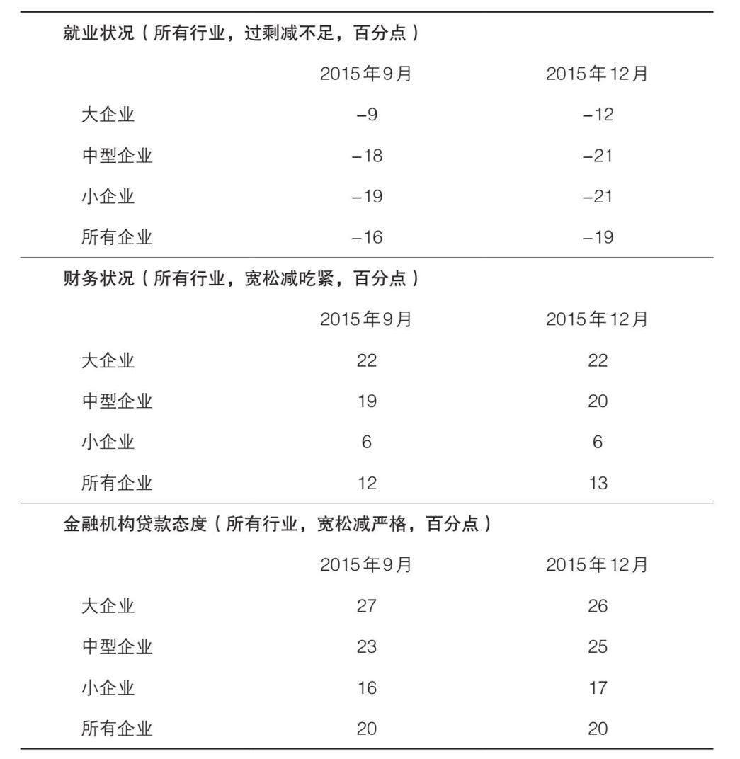 表4.4展示了对其他问题的扩散指数,包括就业状况、财务状况和银行贷款态度。将2015年9月与2015年12月进行对比,我们发现经济状况变化不大。