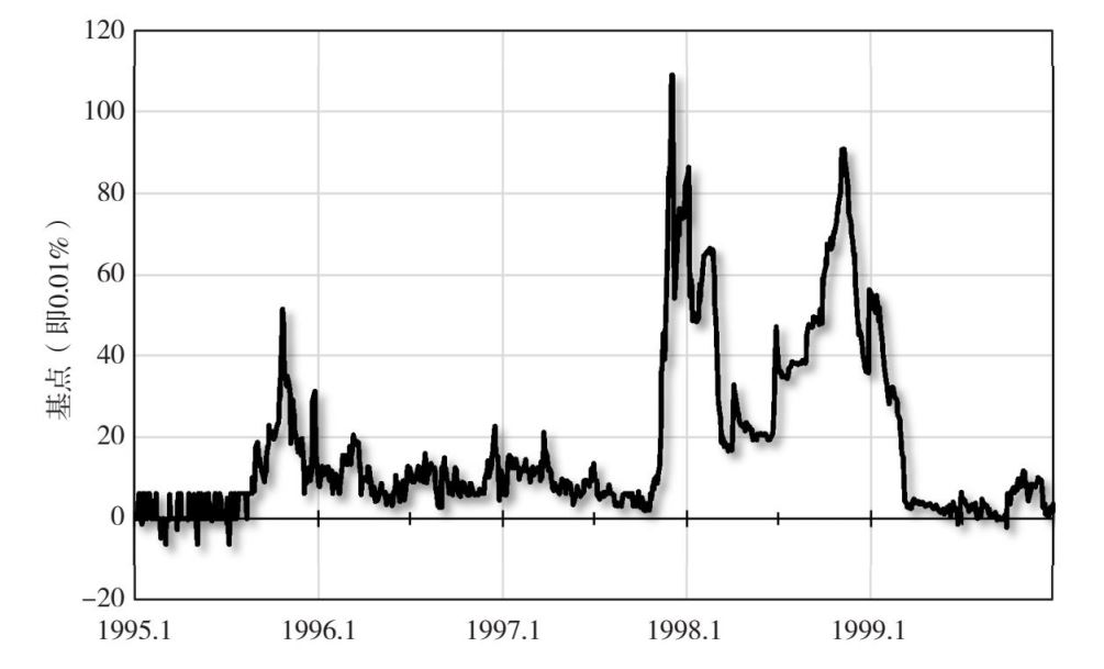 图5.6显示了日本溢价,计算方法为3月期欧洲美元的东京银行间同业拆借利率(TIBOR)与3月期欧洲美元的伦敦银行间同业拆借利率(LIBOR)之间的差额(引自Ito和Harada,2005)