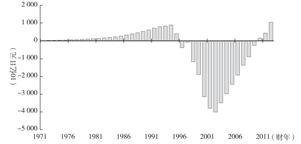 1995年,私人部门银行分析师对木津、环宇和兵库银行的破产感到震惊,他们估计了大型银行不良贷款的规模并发出警告,称整个银行业都很脆弱。大藏省否认大型银行的偿付能力存在任何风险。在这份公开声明发表后不久,当兵库银行在1995年8月破产时,存款保险公司积累的准备金已经耗尽,从理论上讲,存款保险公司也已经资不抵债了(详情参见Cargill、Hutchison and Ito,1997,第127—132页)。这意味着,至少在短期内,对濒临破产的银行提供的进一步援助可能需要由政府提供资金,也就是由纳税人出钱。图5.5显示了存款保险公司的准备金(累积保费减去营运成本和资金援助)随时间变化的情况。准备金赤字不断累积,一直持续到2002年,直到2009年才恢复为零。