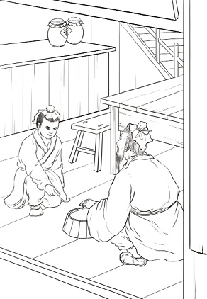 漱洗之后,那少年到厨房,见王猛说:“王掌柜原来在这里,叫我好找。家主人和吕先生在堂屋有请。”王猛随少年到上房堂屋,权翼和吕婆楼忙起身相迎。权翼问:“王君夜来受惊了吧?”