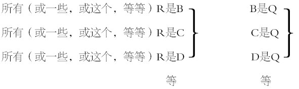 如果我能断言“所有R是Q”,就能断言“R 1 、R 2 、R 3 等是Q”;如果我能断言“R 1 、R 2 、R 3 等是Q”,就能断言“所有R是Q”。我们这里引用的都是多样性同一,差异性相似和部分与整体统一的直言命题。明示推理是从部分到整体,从整体到部分;推理公式是,一类或一组中的每个部分表达的可能是整类或整组分别表达的,一类或一组分别表达的可能是该组或类任何部分所表达的。最后,从一系列命题,如: