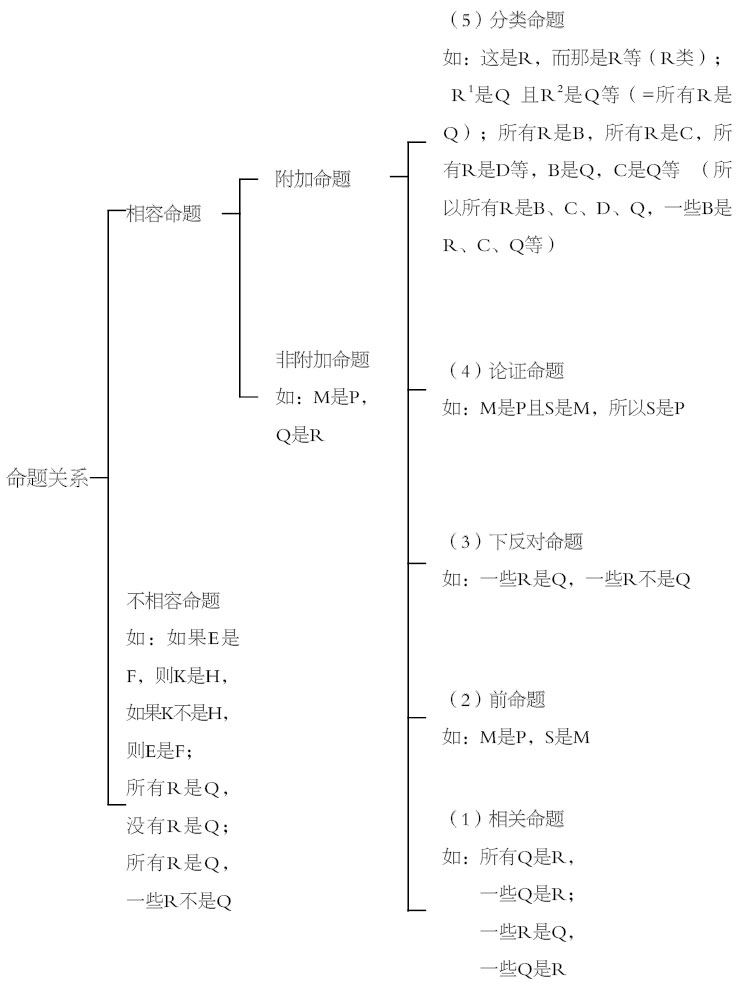 命题关系可以是相容的,也可以是不相容的。相容命题可能是附加命题或非附加命题;附加命题分为相关的、先决的、下反对的、论证的或分类的。命题关系可能无法通过观察看出来;但命题之间不能通过连接词连接,除非:(1)它们确实有联系;(2)为了某种目的或目标而用它来补充说明这种联系。