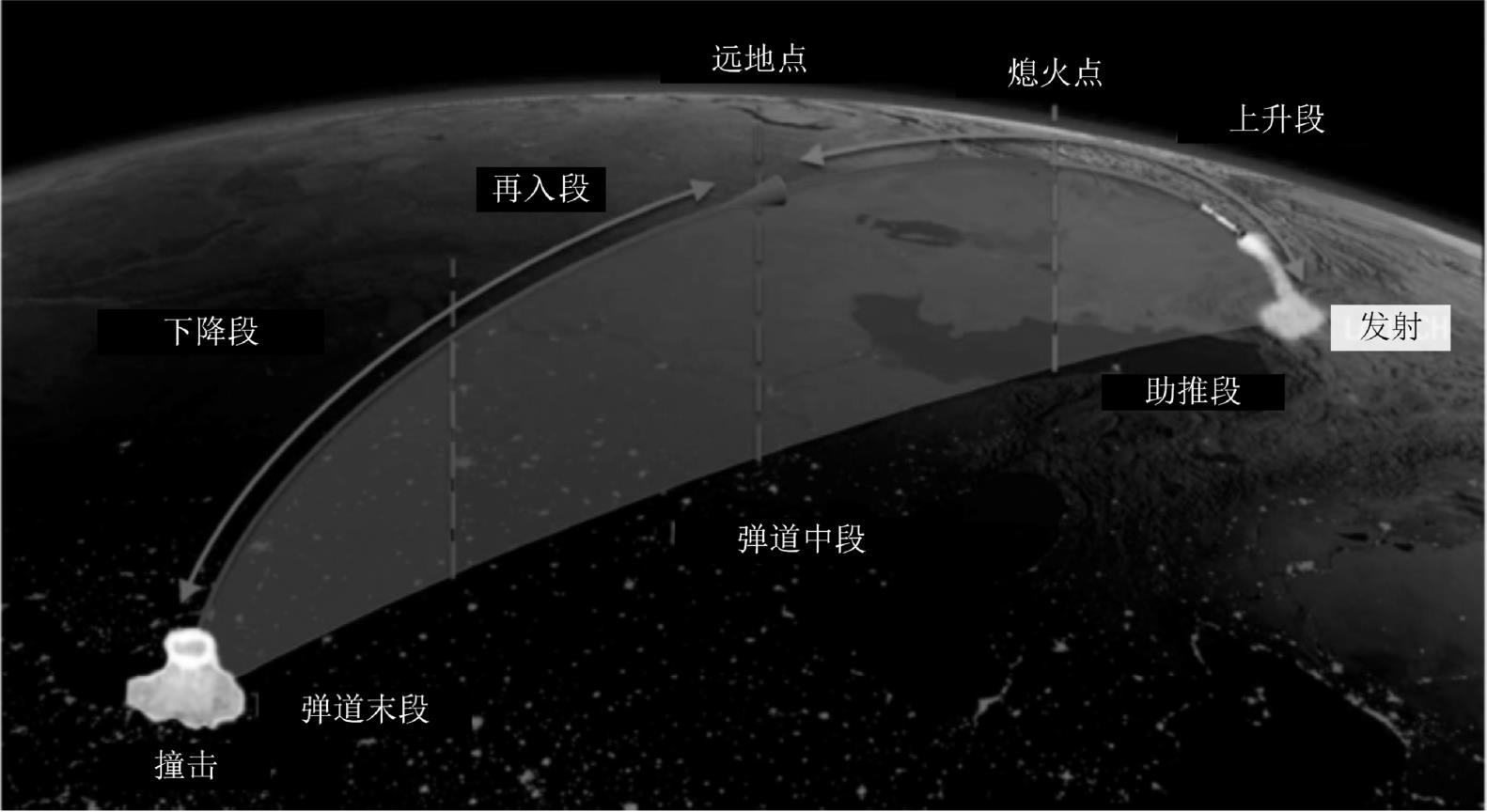 主动防御即在空中将导弹摧毁,从而避免导弹对地面造成损伤,是目前广泛发展的导弹防御手段。主动防御系统可以根据导弹的飞行阶段进行划分,弹道导弹的飞行阶段可以划分为弹道助推段、弹道中段和弹道末段,如图1.22所示。