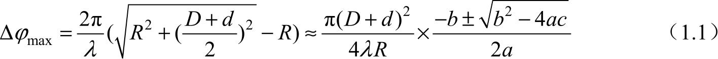 由发射天线等效的相位中心辐射的电磁波经过距离 R 到达接收天线口面,以接收天线口面中心为参考,口面边缘的相位差为