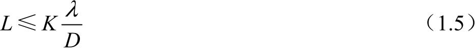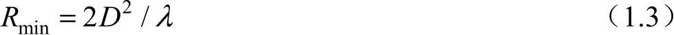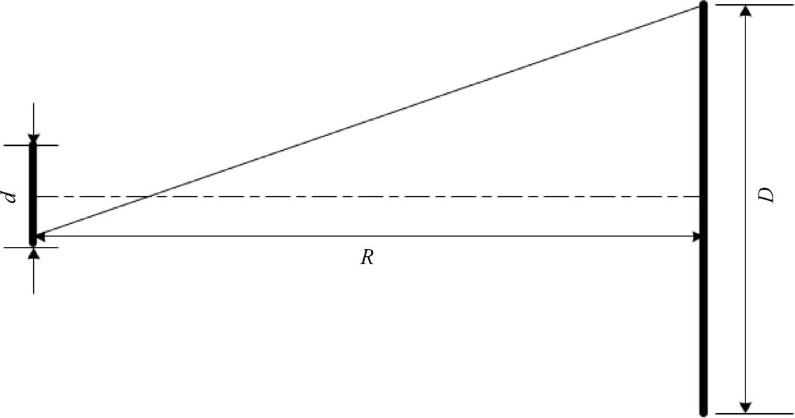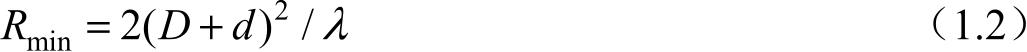在过去相当长的时间内,用式(1.2)来确定收发天线间的最小测试距离。但由于在三元组合成时,等效辐射点可被看成一个点源信号,因此,在辐射式仿真系统中,等效辐射源的口径尺寸可忽略不计,故式(1.2)简化为