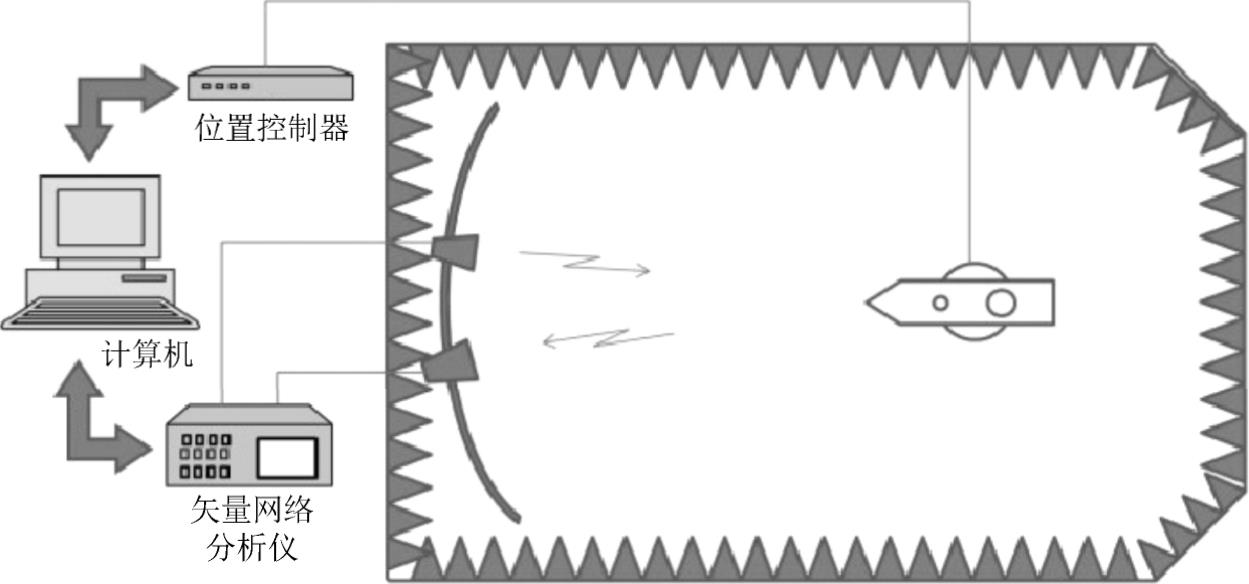 在辐射式仿真中,国内外基本采用冲激脉冲与扫频信号开展目标测量,得到目标电磁特征。冲激脉冲目标测量通过发射极窄脉冲对天线特性和目标特性进行测量。一方面,短脉宽使得信号对应的带宽较大,从而利于获取目标的宽带散射特性;另一方面,冲激脉冲脉宽较短,其对应的盲区也较小,从而使得目标回波与发射信号在时域即可分离,因此在较小的微波暗室中就能完成对目标的测量任务。文献[69]中的冲激脉冲目标RCS暗室测量场景,如图1.30所示。
