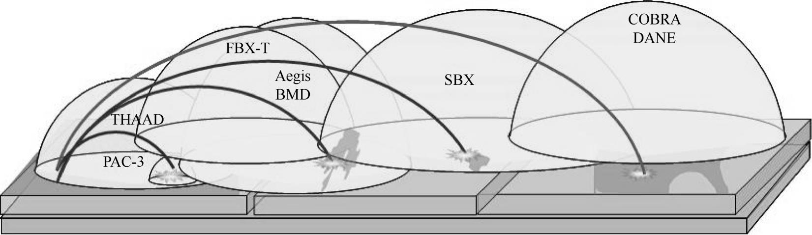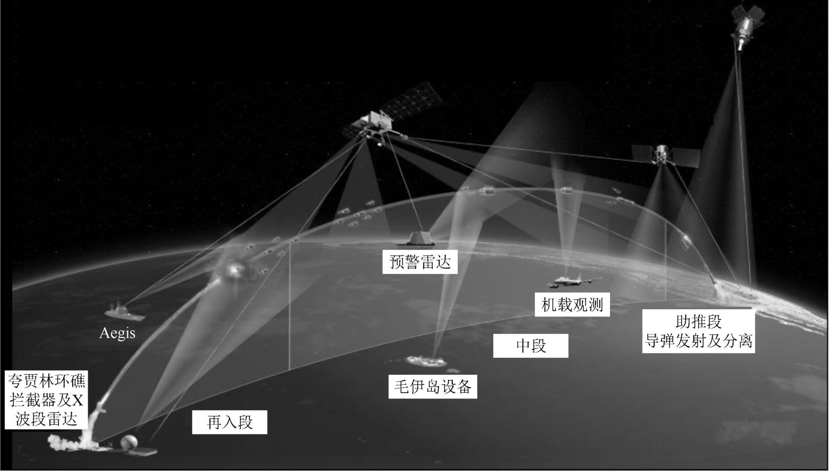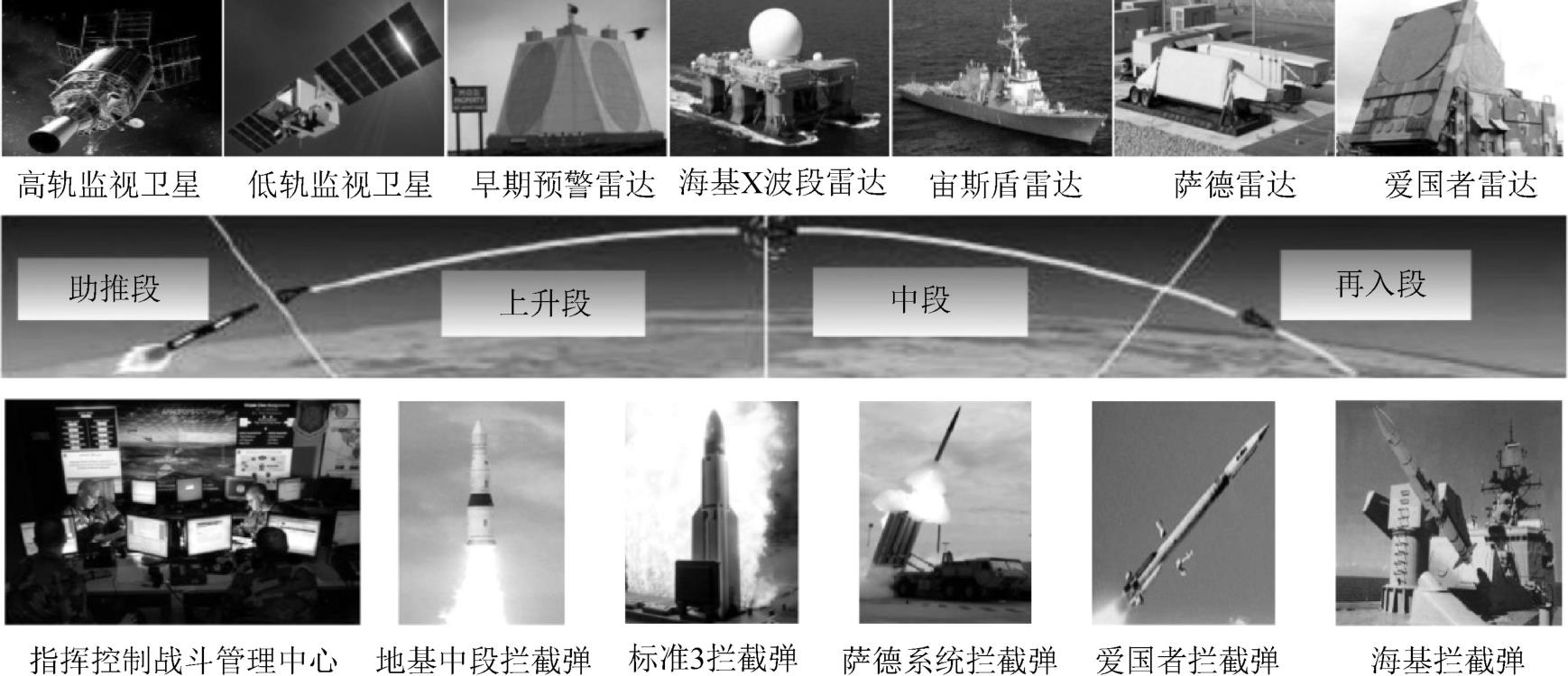 本书主要针对导弹攻防场景,开展辐射式仿真应用研究。为了防御空间威胁目标,美国大力发展导弹防御技术,已建立多层次、一体化导弹防御体系,如图1.19所示。