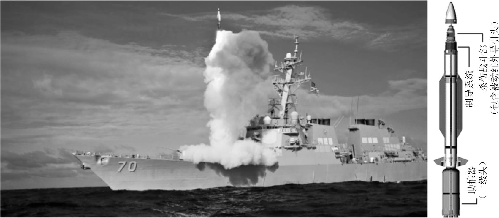 弹道中段飞行持续时间长,弹道可以根据长时间的观测估计出微动等特征,用来区分真假目标,因此中段反导是导弹拦截的重要手段。目前,美国标志性的弹道中段拦截系统主要分为海基弹道导弹拦截系统和地基弹道导弹拦截系统。其中,地基弹道导弹拦截系统在2002年由国家导弹拦截系统更名为陆基导弹拦截系统,用以区分与海基导弹拦截系统和空基导弹拦截系统的不同。目前,美国为人所知的宙斯盾弹道导弹拦截系统就属于海基中段弹道导弹拦截系统,该拦截系统从1999年到2008年总共进行了20次拦截试验,其中16次获得成功,4次失败。宙斯盾弹道导弹防御试验和中段弹道导弹拦截系统分别如图1.24和图1.25所示。