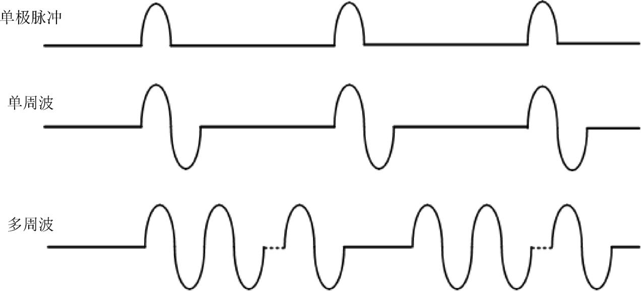 理想的单位冲激信号是无法用物理实现的,仅具有数学意义。实际应用中可以采用的冲激脉冲信号并没有严格的定义和要求,大致上可分为如下几类:单极脉冲、单周波、多周波,如图1.37所示。