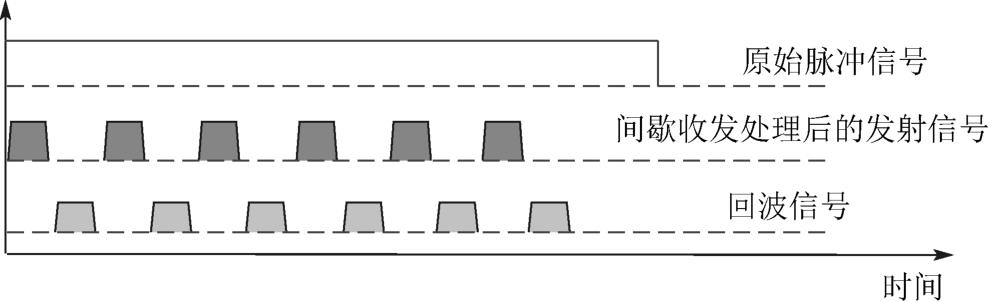 2006年,王雪松教授提出间歇采样转发干扰,该方法通过使用DRFM对雷达信号进行低速率的“采样—转发—采样”交替处理,可以有效解决突防设备中的收发隔离问题。因此,利用间歇采样对脉冲雷达信号进行分段发射和接收,可以解决微波暗室内脉冲雷达信号收发遮挡与互耦的问题,如图1.42所示。