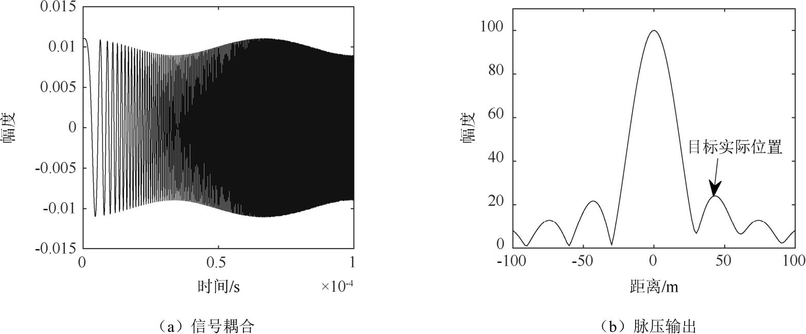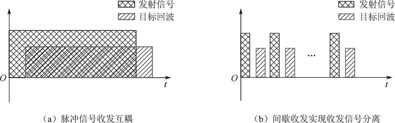 在构建辐射式仿真场景时,应尽量逼真模拟雷达信号样式、工作模式等。然而,雷达脉冲时长对应的传播距离通常远大于室内场微波暗室的尺寸,直接将雷达脉冲引入室内场进行辐射式仿真,信号还未发射完毕,目标回波将到达接收天线,使得雷达接收端面临严重收发互耦问题,如图1.41所示。