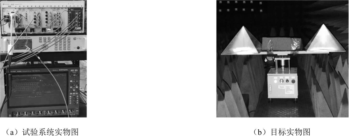 间歇收发处理是对原始脉冲雷达信号的欠采样处理,需要进一步研究信息重构方法,消除欠采样带来的失真问题。针对该问题,可以结合间歇收发处理后的信号时频域特性及回波分段欠采样特性,进行回波处理与信息重构研究。刘晓斌等针对线性调频、相位编码等典型脉冲信号,分析了间歇收发处理的收发策略与回波特性,并基于压缩感知给出了目标回波重构方法,分析了间歇收发重构回波与完整脉冲回波的信息一致性,并通过仿真进行验证。针对半实物仿真系统在收发信号时难以得到理想矩形脉冲的问题,建立了在非理想条件下的梯形脉冲收发控制信号回波模型,并通过理论推导与仿真试验,验证了非理想间歇收发重构回波所得目标信息与理想方式所得结果一致。图1.44所示为构建的间歇收发脉冲雷达目标测量试验系统,通过该试验系统,在微波暗室中开展目标测量试验,验证了间歇收发处理及回波重构方法的有效性。