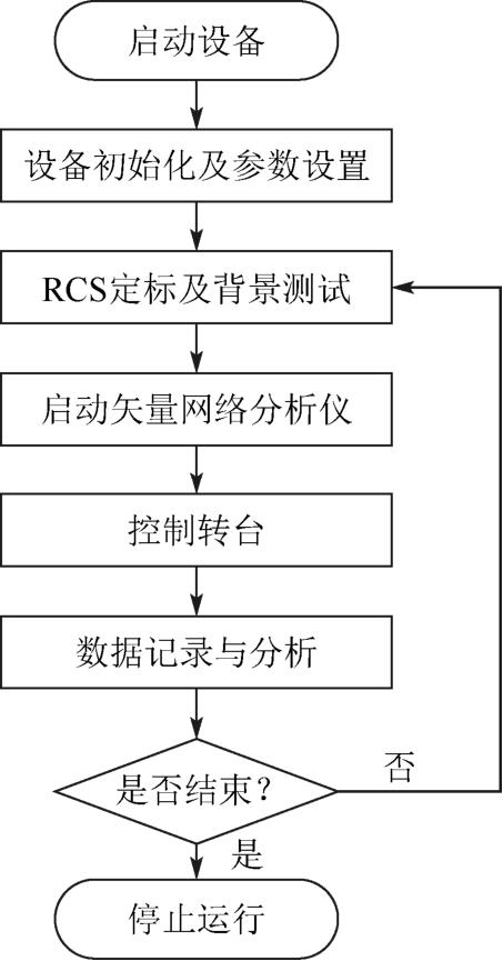 扫频信号动态仿真测量流程如图1.40所示。当启动设备之后,通过设置初始化参数,分别获取定标体的RCS数据和暗室的背景数据。然后启动矢量网络分析仪发射扫频信号,通过控制转台得到不同角度下的目标散射信息,并记录测量的散射数据。当结束测量后,结合定标体的RCS和暗室的背景数据,对测量的目标散射信息进行分析。