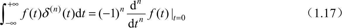 设 δ ( t )广义的 n 阶导数为 δ ( n ) ( t ),则对于任意函数 f ( t ),其与 δ ( n ) ( t )乘积的无限积分满足如下关系: