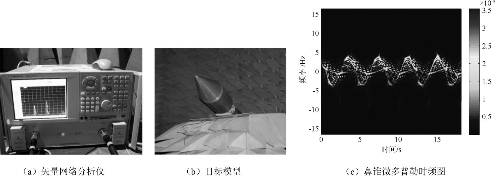随着对雷达目标运动特性认识的加深,国内学者利用微波暗室射频仿真的方法,对雷达的宽带目标特性开展了广泛研究。国防科技大学的刘进等通过设计进动目标模型(见图1.17),构建了紧凑场微波暗室动态测量系统,采用扫频信号得到并分析了空间进动目标动态散射特性,如图1.32所示。北京航空航天大学的高旭等,在微波暗室中利用扫频信号研究了飞机目标中缝隙部位的电磁散射特性。