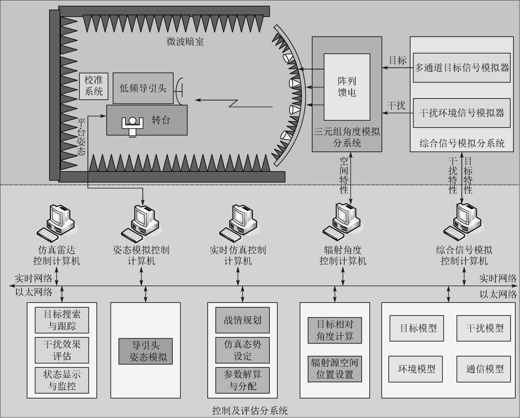 开展雷达导引头技术状态检测试验主要通过导弹制导半实物仿真试验系统来完成,该系统主要由微波暗室、三轴试验转台、复杂电磁环境信号模拟系统、试验显控系统、仿真计算机、数据采集系统、数据库和通信网络组成。