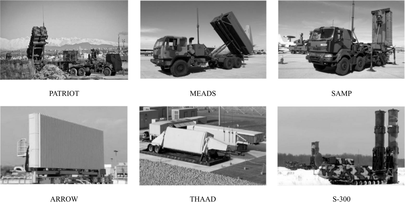 末段弹道导弹拦截系统用来拦截大部分的空中威胁目标,如末段弹道导弹、巡航导弹和空对地制导导弹等。因此,各国都在末段弹道导弹拦截系统的研制上投入很多,目前比较成熟的拦截系统有爱国者(PATRIOT)、扩展中程防空系统(MEADS)、SAMP、ARROW、THAAD、S-300等,如图1.26所示。