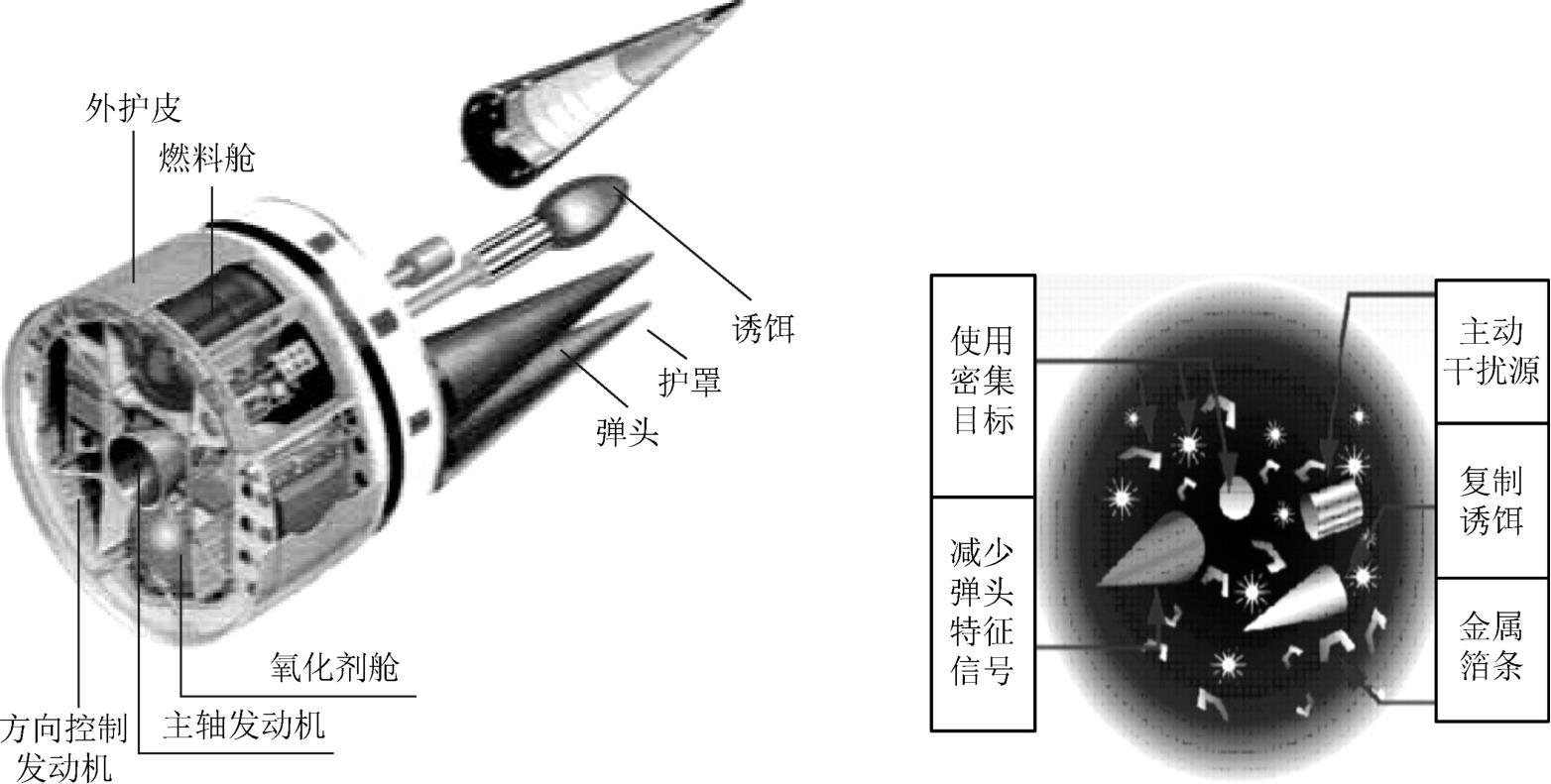 弹道导弹为了提高与导弹防御系统的对抗能力,通常采用真假多目标突防手段,在防御系统的光学、雷达传感器中呈现多目标的态势。雷达传感器是导弹防御系统中的核心传感器,是弹道导弹面临的最大的探测和识别威胁。针对导弹防御系统雷达,弹道导弹在突破导弹防御系统过程中采用的多目标,主要包括真目标本体、无源假目标、有源假目标等,如图1.21所示。其中,目标本体采用多种电磁超材料、电磁吸波材料等电磁特征控制手段,实现高隐身性能;无源假目标主要包括多种模拟真目标本体电磁特征的假目标,使导弹防御系统雷达无法辨识真目标和无源假目标;有源假目标主要包括欺骗式电子干扰装置生成的多种电子假目标,干扰导弹防御系统雷达探测和识别,从而掩护真目标。