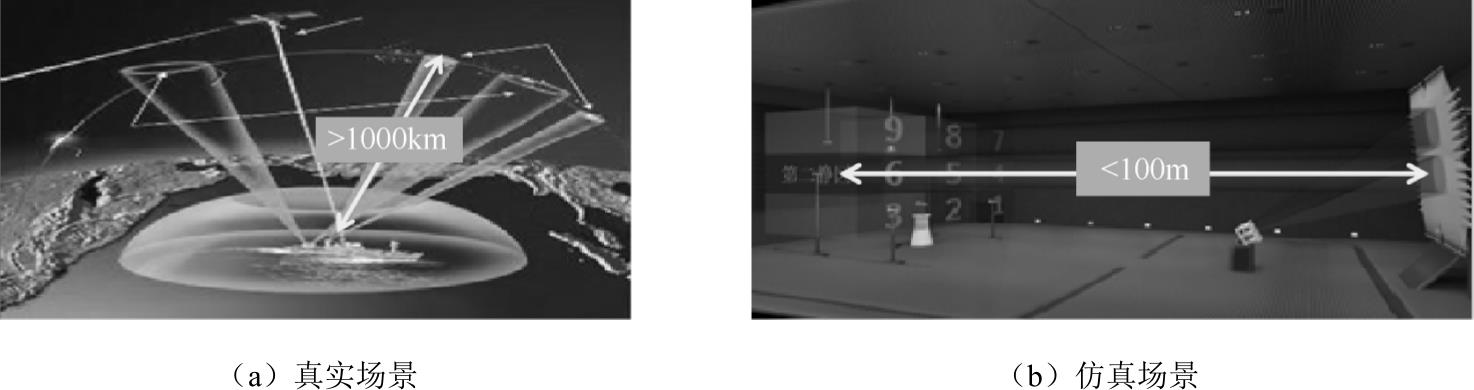 在外场环境中,目标与雷达距离在1000km以上。而微波暗室空间受限,天线与目标距离较近,至多100m,如图1.33所示。由于脉冲信号存在盲区,在收发分时方式下,发射信号与接收信号将会在接收天线处产生遮挡,无法获取完整的目标回波。在收发同时方式下,接收天线将会收到发射天线的强耦合信号,使得收发信号难以被有效分离。在收发天线之间放置隔离器,可以降低信号互耦的程度,但是对隔离器的设计提出了较高要求。因此,如何解决信号收发遮挡与互耦,是脉冲雷达辐射式仿真面临的关键性技术难题之一。