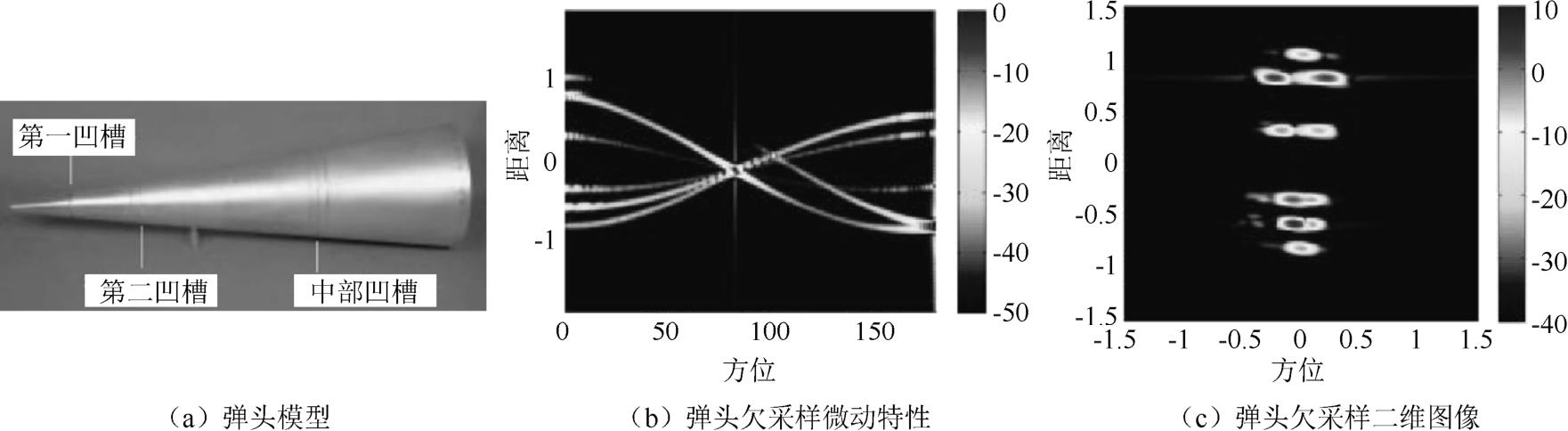 扫频测量是在一定带宽内产生不同频点的信号,然后进行合成,从而实现宽带测量。扫频测量通常是利用矢量网络分析仪的扫频源发射出扫频信号,其精度更高,能够包含整个扫频宽度内各频点的目标特性信息,进而获得目标高分辨距离像,是目前雷达目标特性测量广泛采用的方式。美国林肯实验室在微波暗室内,通过发射扫频信号,对弹头目标微动特性进行了测量。文献[73]中,O'Donnell A N等利用该数据,对弹头目标的欠采样数据进行了目标特性分析,如图1.31所示。