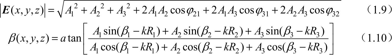 式中, φ 21 = ( β 2 -β 1 ) -k ( R 2 -R 1 ); φ 31 = ( β 3 -β 1 ) -k ( R 3 -R 1 ); φ 32 = ( β 3 -β 2 ) -k ( R 3 -R 2 )。