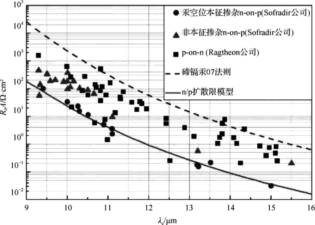 图2-5 不同结构HgCdTe器件品质因子 R 0 A 值随截止波长变化的曲线