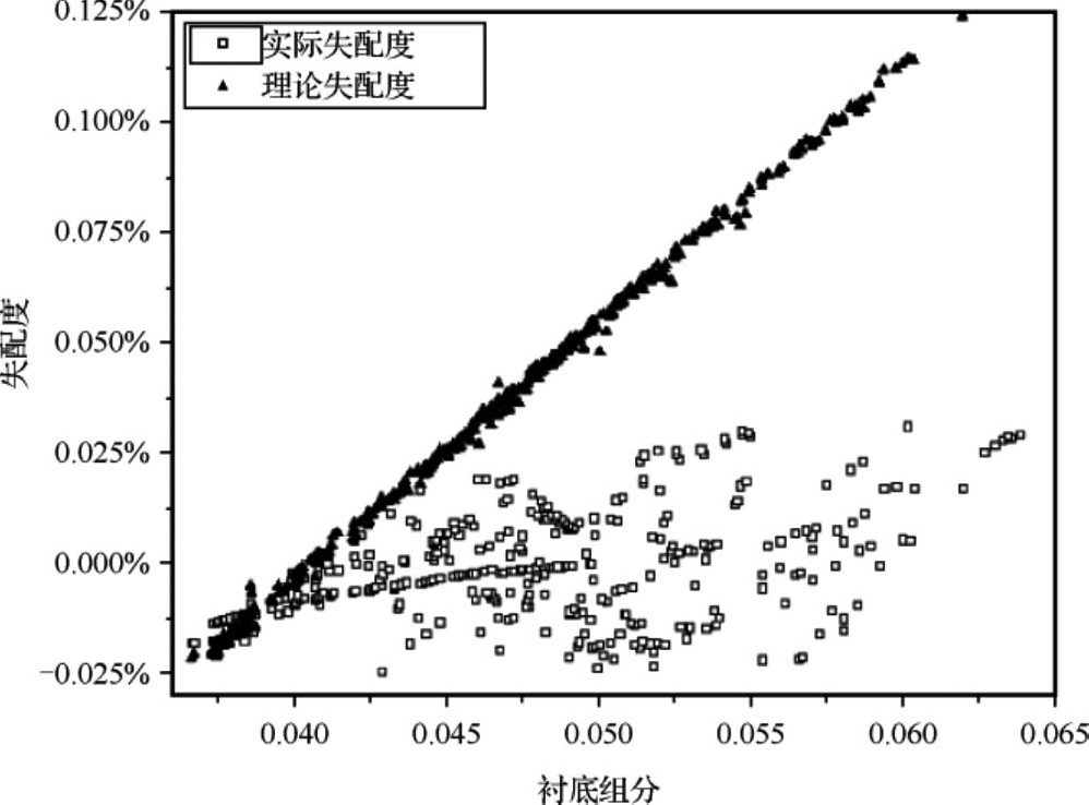 HgCdTe外延晶格常数调控技术的开发及使用,使衬底的使用率从28%上升到接近95%,显著降低了外延成本。统计近400轮0.295~0.315组分的中波外延材料及所使用的衬底数据,进行晶格失配度与衬底组分关系分析,分布情况如图2-12所示,三角形分布点为未经过工艺改进,通过式(2-2)计算的晶格失配度;方形分布点为工艺改进后实际测得的晶格失配度。其中,外延、衬底晶格常数通过XRD测得,衬底组分通过式(2-3)计算得到,由红外光谱仪测试得到外延组分。使用的衬底组分覆盖0.036~0.065的范围,而晶格失配度都能控制在-0.025%~0.031%范围内,衬底使用率显著提升。