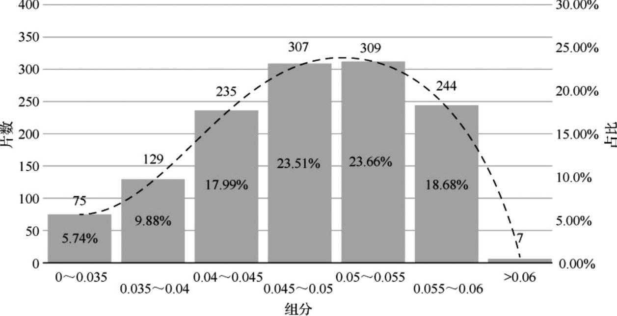 MARTINKA的实验结果显示 [28] ,抑制cross-hatch的条件是晶格失配度控制在-0.025%~0.031%。根据统计结果,为避免月牙斑及cross-hatch等X射线貌相缺陷,获得高质量的外延片,晶格失配度的控制范围与此接近。根据式(2-2)(HgCdTe晶格常数与Cd组分的关系式)和式(2-3)(CdZnTe晶格常数与Zn组分的关系式)计算可得 [29] ,制备Cd组分为0.295~0.315的中波HgCdTe外延,并将晶格失配度控制在-0.025%~0.031%,衬底的Zn组分应控制为0.0354~0.0464。碲锌镉晶锭由于组分分凝,存在纵向组分梯度。从图2-11中的统计数据看,0.035~0.045组分范围内的碲锌镉衬底占比仅为28%左右。