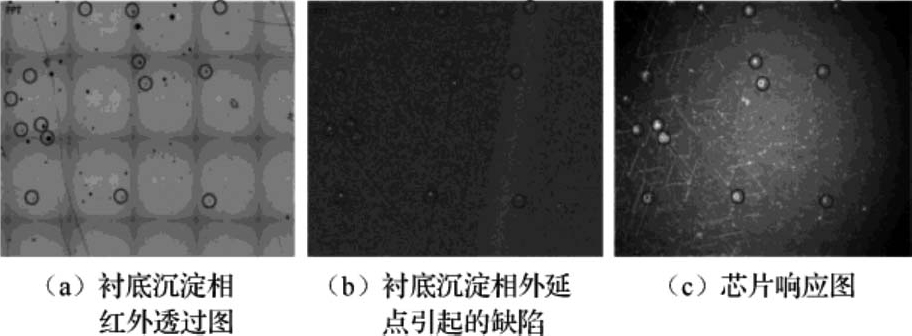 焦平面成像时,一些红外焦平面芯片响应图出现了六角形或三角形缺陷,而与周围正常区域的响应不同。通过分析衬底的红外透射显微图像、外延层的XRT图像、红外焦平面芯片响应图,发现这些缺陷与衬底夹杂物有极大的关联。衬底夹杂物有Cd夹杂物及Te夹杂物两种,Cd夹杂物一般呈六角形,Te夹杂物一般呈三角形。衬底夹杂物的尺寸和密度越大,红外焦平面芯片响应图中出现三角形或六角形白点的概率就越大。衬底表面或几微米深处的夹杂物会延伸到外延层,使外延层局部成分和应力产生差异,导致红外焦平面芯片成像产生差异,如图2-15所示。控制基底夹杂物的尺寸和密度可以有效地提高红外焦平面芯片成像的质量。