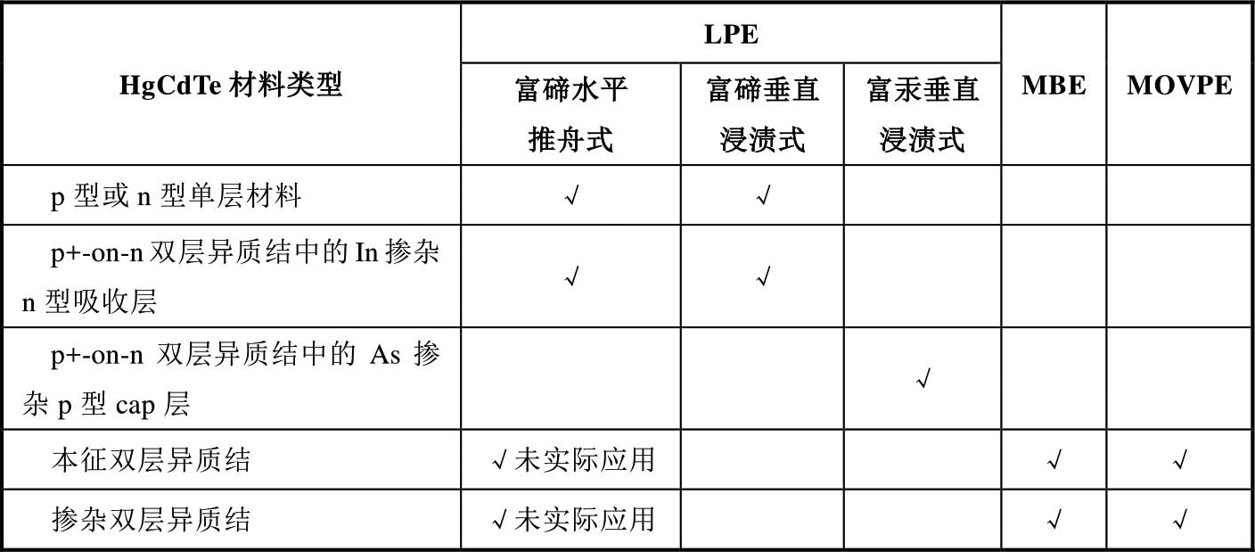 表2-3 几种外延生长技术制备的HgCdTe材料类型