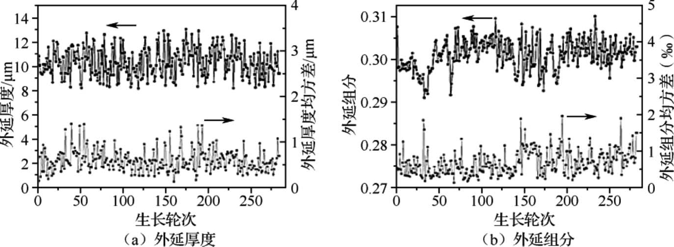 (1)汞损失控制:合理的腔体结构设计、生长工装结构设计及生长控制是保证汞损失稳定的关键因素。当汞损失出现母液总质量0.2%的偏离时,会严重影响技术人员对厚度、组分的预判,导致厚度、组分不可控,从而无法实现批量生产。