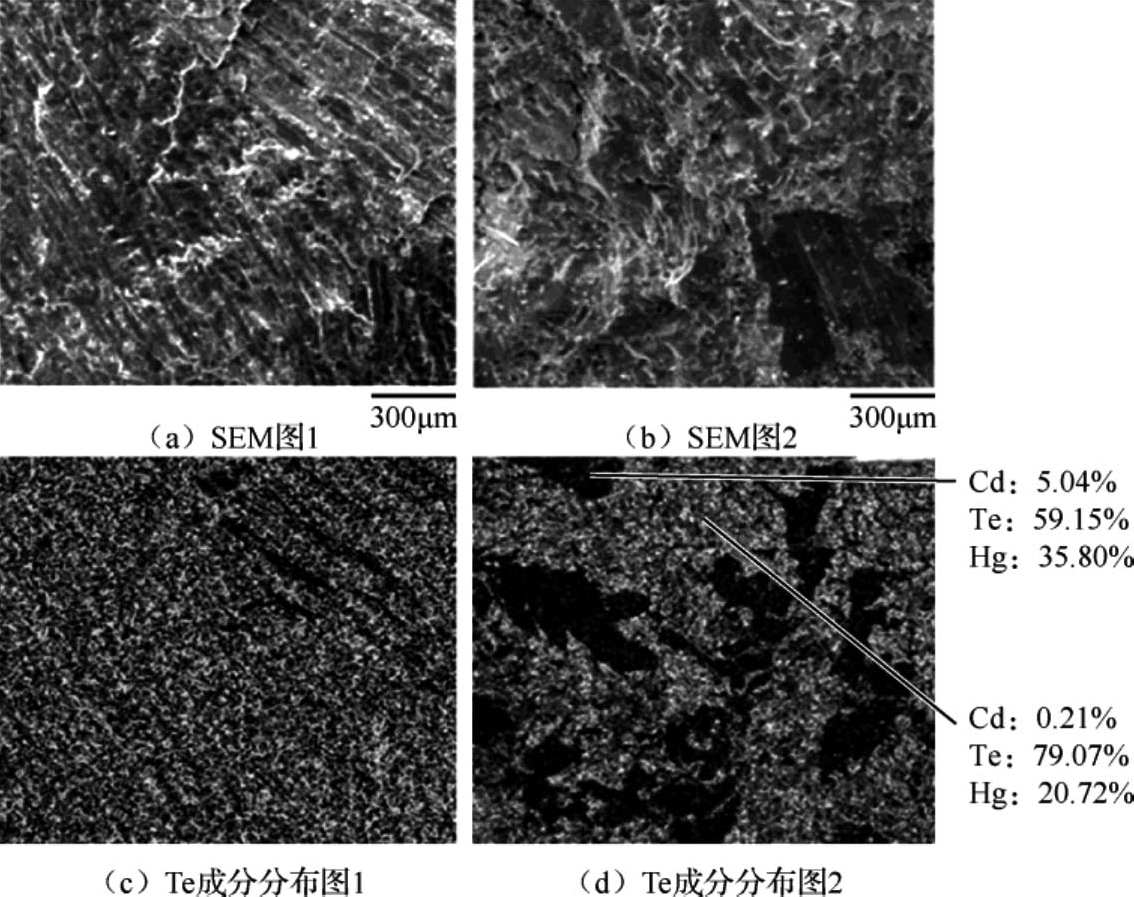 采用富碲垂直液相外延生长方式进行HgCdTe材料的制备,在批量生产中优势显著,但同时也对汞损失控制、温区控制提出了更高的要求。垂直液相外延为半无限母液的生长方式,其优点是母液可以重复使用,但每轮生长完成后,母液都会经历一次降温过程,导致母液中析出HgCdTe晶体。图2-7所示为不同母液的扫描电镜能谱面分析,其中,图(a)、(b)分别为母液高温均匀化后及生长完成后的SEM图;图(c)、(d)为对应区域的Te成分分布图。可以看到,均匀化后的母液成分分布均匀,而在经历降温生长后的母液中可以明显看到HgCdTe晶体。HgCdTe晶体的熔解需要长时间高温均匀化及搅拌运动,若无法在外延生长阶段前充分熔解,则将影响到HgCdTe外延组分、厚度均匀性控制,严重时将形成无法熔解的HgCdTe晶体,导致母液无法重复使用。