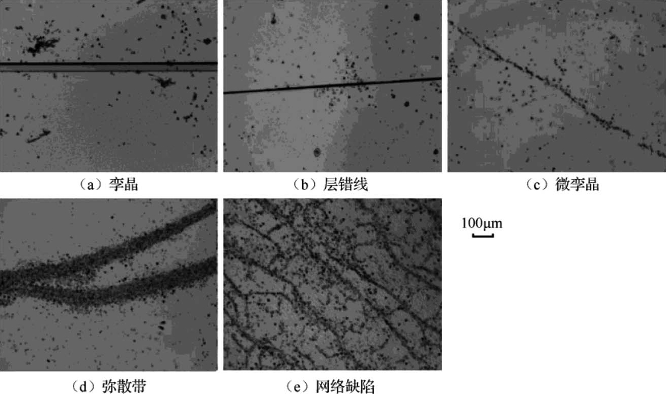 HgCdTe外延缺陷的主要来源有两部分,一部分由衬底晶体缺陷引入,另一部分来源于外延生长控制。碲锌镉衬底的单晶完整性是HgCdTe薄膜晶格完整性的基本保证。由于碲锌镉材料的缺陷形成能低,在碲锌镉单晶制备过程中极易形成各类晶体缺陷,如图2-13所示。此类衬底晶格缺陷都将通过外延生长延伸至HgCdTe材料,从而影响红外焦平面芯片成像的均匀性。该类缺陷皆在碲锌镉晶体生长过程中产生,晶片加工时无法避免,因此提高衬底良率的关键仍是提升晶体生长技术水平。通过生长技术改进提高碲锌镉单晶成品率,并制定可行的碲锌镉材料缺陷控制标准,是满足批量生产对碲锌镉材料品质需求的重要手段。