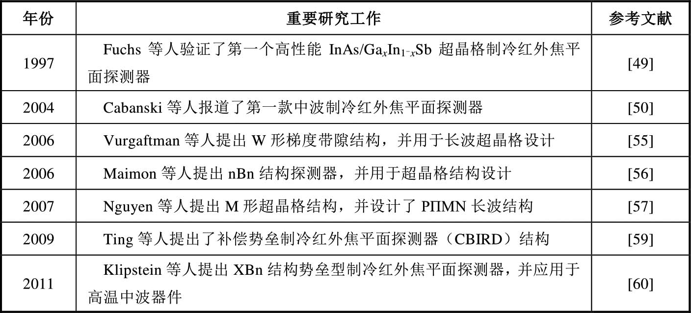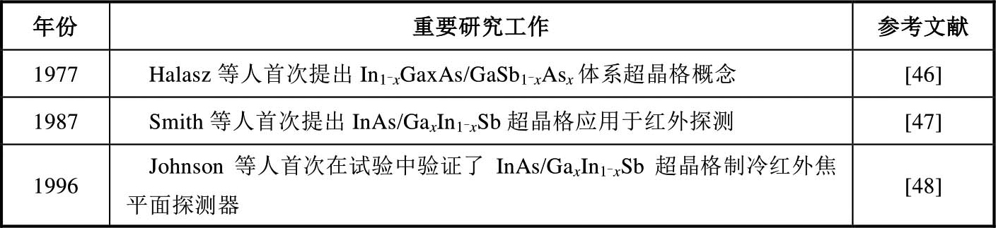 表2-6列出了超晶格基础研究发展历程中的一些重要工作,其中很多研究奠定了超晶格材料的理论和应用基础,为超晶格材料设计和器件制备提供了方法和启发。