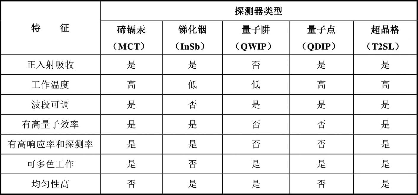 表2-7 不同类型的制冷红外焦平面探测器的特征对比