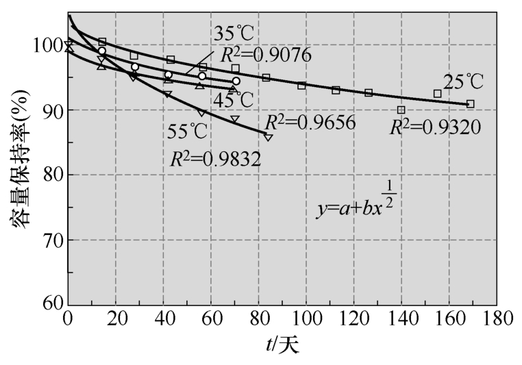 图2-21 磷酸铁锂电池在不同温度的日历寿命测试中的容量衰减及趋势分析
