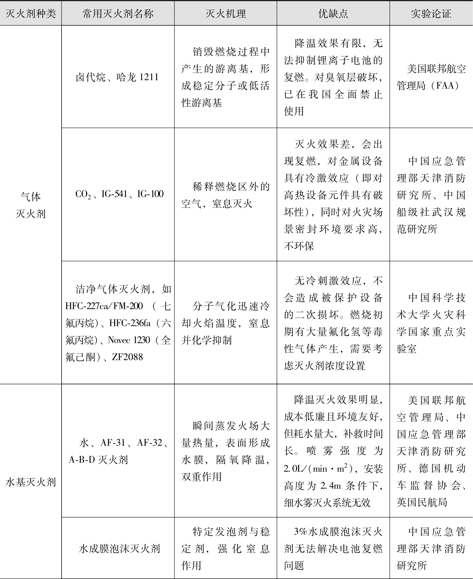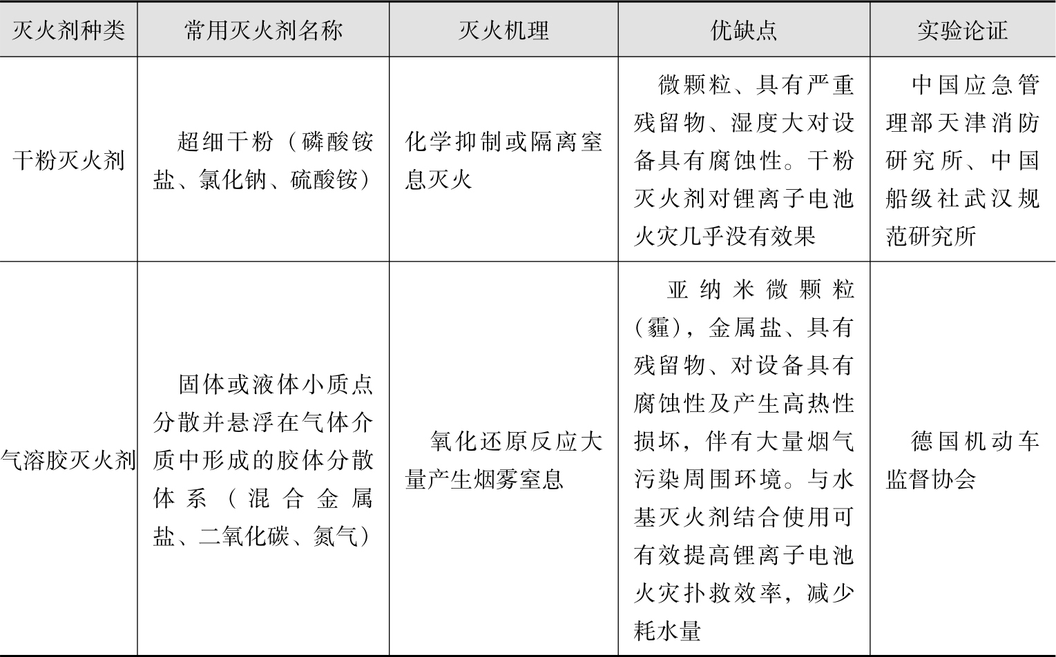 对锂离子电池火灾灭火剂的研究最早发生在航空领域。通过对气、液、固三类灭火剂的灭火机理的研究,来评价它们对储能电站中电池火灾的适用性(见表2-4)。在成本方面,气体灭火剂>固体灭火剂>液体灭火剂。