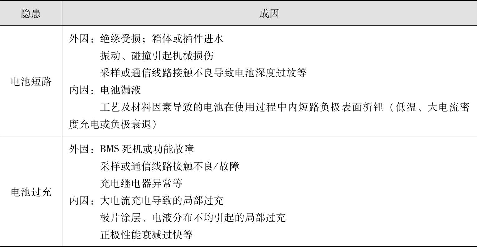 电池中常见的安全隐患有电池短路和电池过充等(见表2-3)。其中电池短路可以分为外因和内因,外因主要包括绝缘受损,箱体或插件进水,振动、碰撞引起机械损伤,采样或通信线路接触不良导致电池深度过放等。内因主要包括电池漏液,工艺及材料因素导致的电池在使用过程中内短路和负极表面析锂等。低温或大电流密度充电时,都会导致严重的析锂,这也是导致负极性能衰退的主要原因之一。