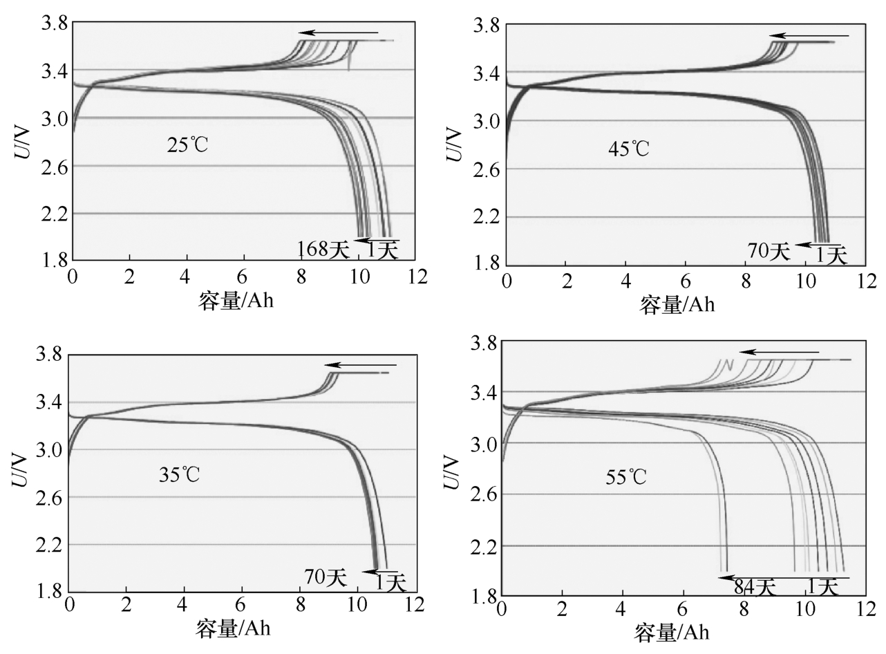 图2-20 磷酸铁锂电池在不同温度的日历寿命测试中的充放电电压随容量衰减变化曲线