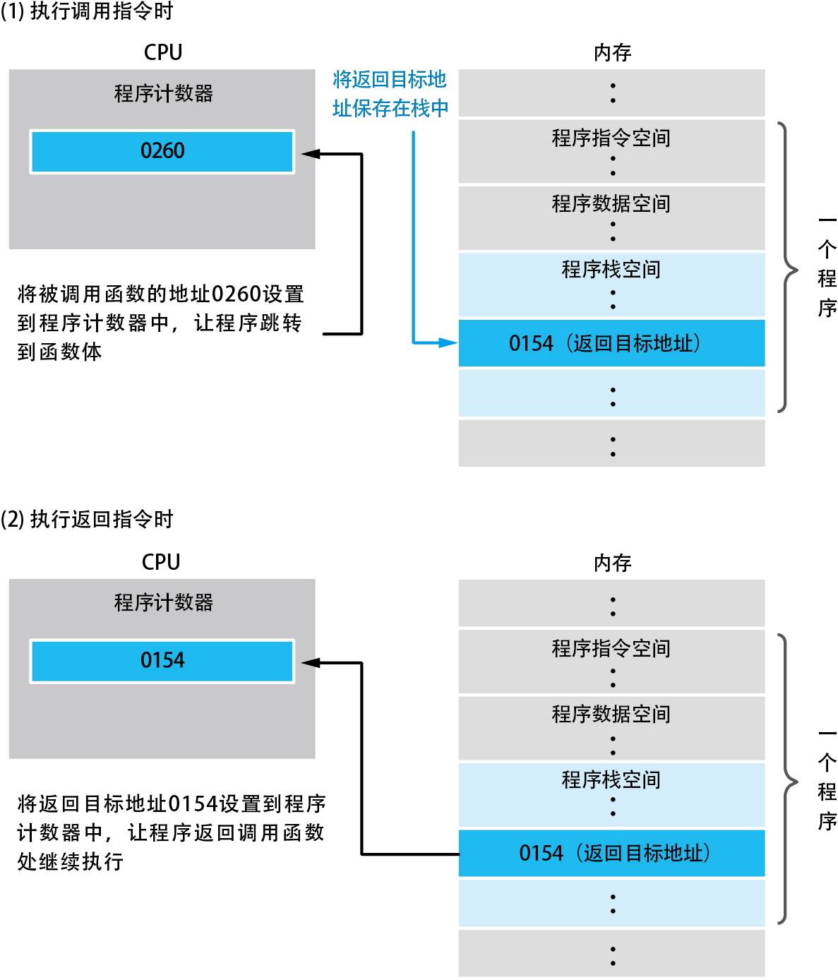 的功能是将保存在栈中的地址设置到程序计数器中。图 1-7 中,在调用 MyFunc 函数之前,程序会先将地址 0154 保存到栈中,MyFunc 函数执行完毕后,程序会从栈中读出地址 0154,然后将其设置到程序计数器中(