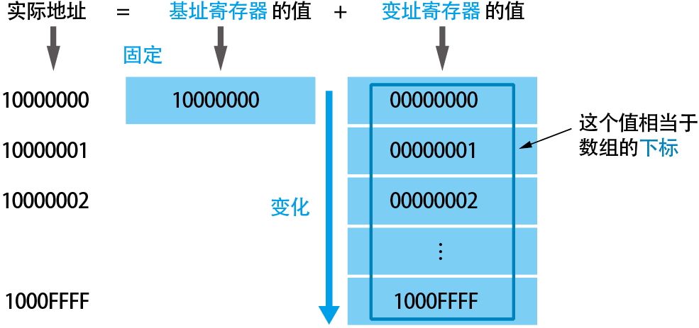 所示,可以将基址寄存器设为 10000000,然后让变址寄存器的值在 00000000 ~ 0000FFFF 变化。CPU 会将基址寄存器和变址寄存器的值相加计算出实际的内存地址,其中变址寄存器的值就相当于高级编程语言程序中数组的下标。