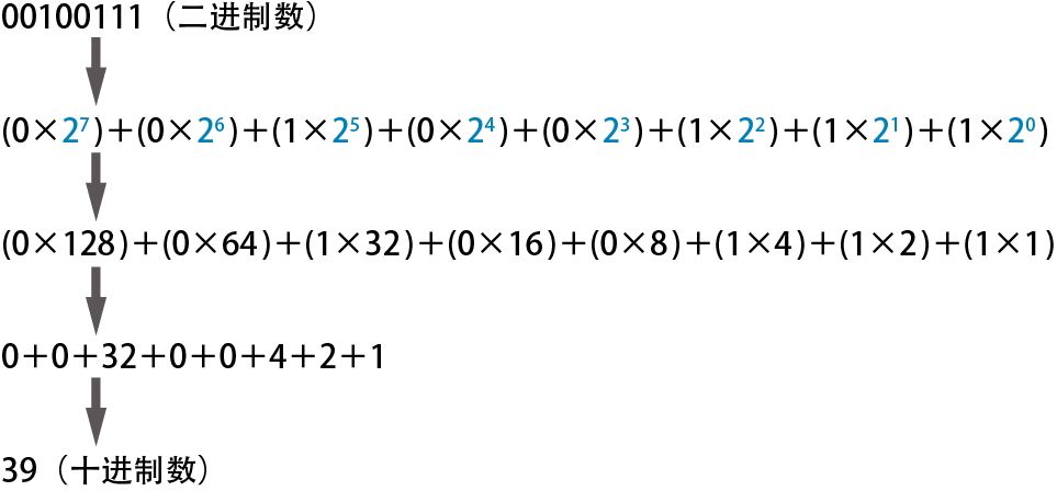 那么,二进制到底是什么呢?为了搞清楚二进制的原理,我们先尝试将 00100111 这个二进制数转换成十进制数吧。要将 二进制数 转换成十进制数,需要将二进制数的各位数字乘以其对应的位权,并将结果相加( 图 2-3 )。大家可以解释清楚为什么要使用这种方法吗?“我也不知道为什么,反正就是记住了这个方法”,这样是不行的。对于二进制转换成十进制的方法,只要理解了二进制的原理,就不需要死记硬背了。接下来,我们一边对比十进制,一边学习二进制的原理。请大家务必掌握这部分内容。