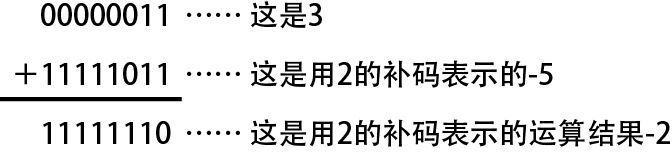 当然,结果不为 0 的运算,使用 2 的补码也可以得到正确的结果。但需要注意的是,如果运算结果是负数,那么这个负数也是以 2 的补码来表示的。我们以 3 - 5 这个运算为例。3 表示成 8 位二进制数是 00000011,5(= 00000101)用 2 的补码表示就是“反转 + 1”,即 11111011,因此 3 - 5 就相当于“00000011 + 11111011”。