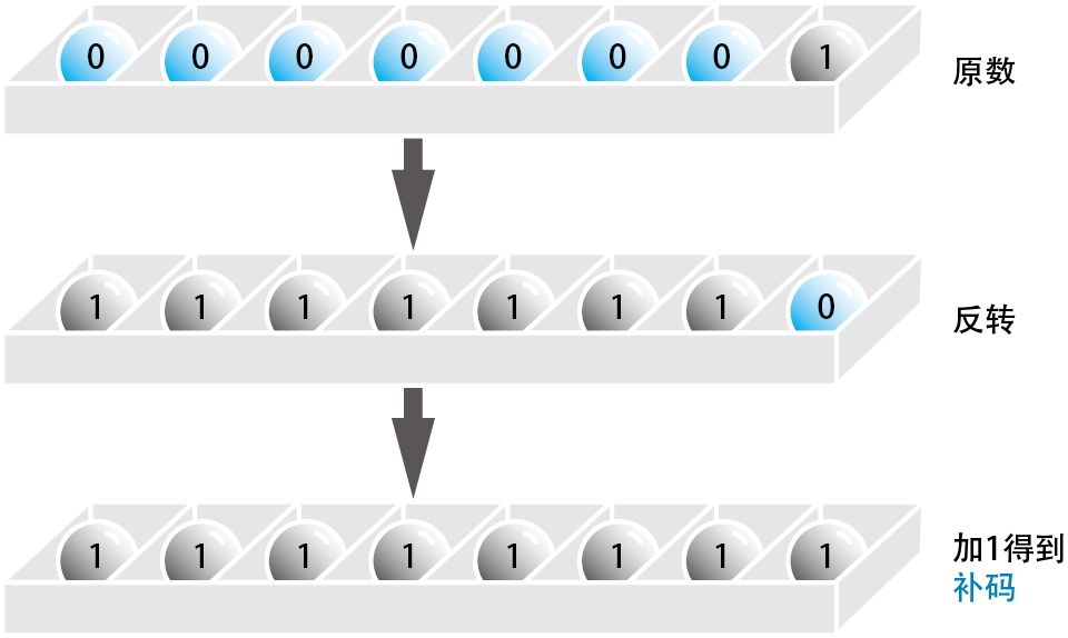 ,然后再将结果加 1。例如,将 - 1 用 8 位二进制数表示,就相当于求 1(即 00000001)的 2 的补码。00000001 的 2 的补码,就是将其各位数字中的 0 变成 1,1 变成 0,然后将得到的结果加 1,也就是 11111111(